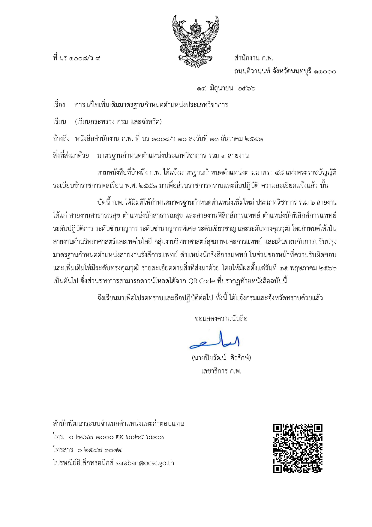 หนังสือสำนักงาน ก.พ. ที่ นร 1008/ว 10 ลงวันที่ 11 ธันวาคม 2551 มาตรฐานกำหนดตำแหน่งประเภทวิชาการ ตำแหน่ง นักสาธารณสุข มีผลตั้งแต่วันที่ 15 พ.ค. 2566